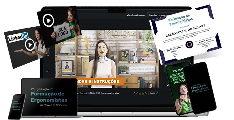 Os principais diferenciais são: primeiro, que é a única formação EAD do Brasil reconhecida pelo MEC. a Além disso, sua professora atua ativamente nas empresas com ergonomia há 8 anos, portanto te passará a prática do dia a dia e não apenas teoria como na maioria das capacitações. Ainda, por 12 meses você terá o acompanhou tirando dúvidas com a Debora Dengo, para te guiar no seu começo, aprenderá e receberá o modelo dos laudos das Debora em word editável para iniciar nas empresas já realizando uma análise ergonômica de alto nível. A didática de Debora Dengo é incomparável no mercado, pois em toda aula mostra exemplos práticos de análises reais feitas em empresas em vídeo, mostrando o passo a passo, é como se você estivesse dentro da empresa atuando junto com a Debora, pois enxergará dentro do curso o que os olhos dela enxergam através das centenas de vídeos e fotos de análises reais. como E pra fechar, aprenderá as técnicas mais atuais de prospecção, captação e fechamento com as empresas para entrar no mercado de trabalho rapidamente, sabendo quanto e como cobrar pelos serviços de ergonomia prestados. A Debora não esconde nada ou retém informação. 100% das estratégias de atração, captação e fechamento de clientes que ela aplica em sua empresa, na Soluções Ergonômicas, ela compartilha em detalhes com os alunos.